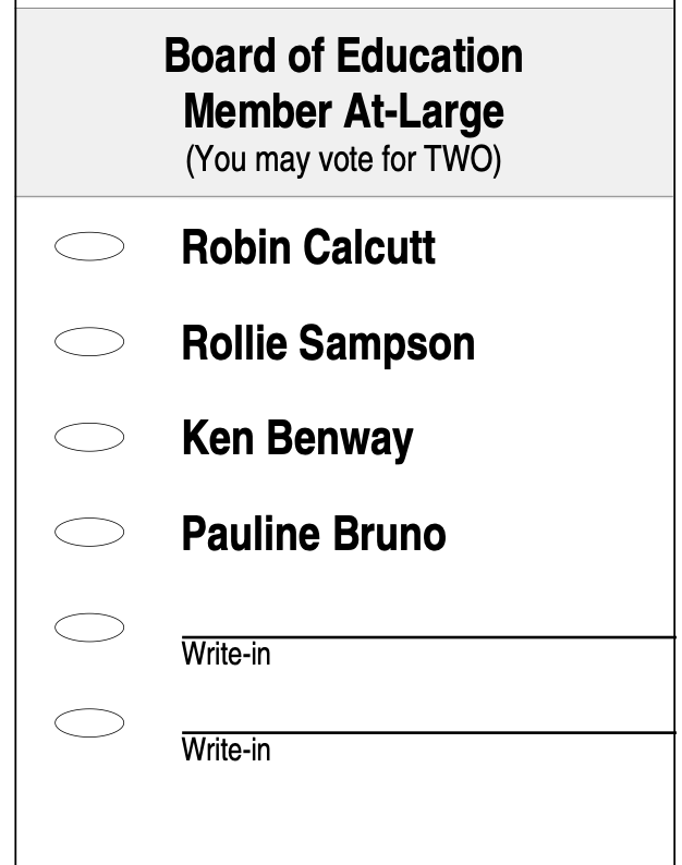 Robin Calcutt and Rollie Sampson are long-time bureaucrats (Democrats, too) at the central office. They think public schools are perfect as-is. Ken Benway and Pauline Bruno are the conservative, families-first candidates in this race. Bruno and Benway are the two choices here.