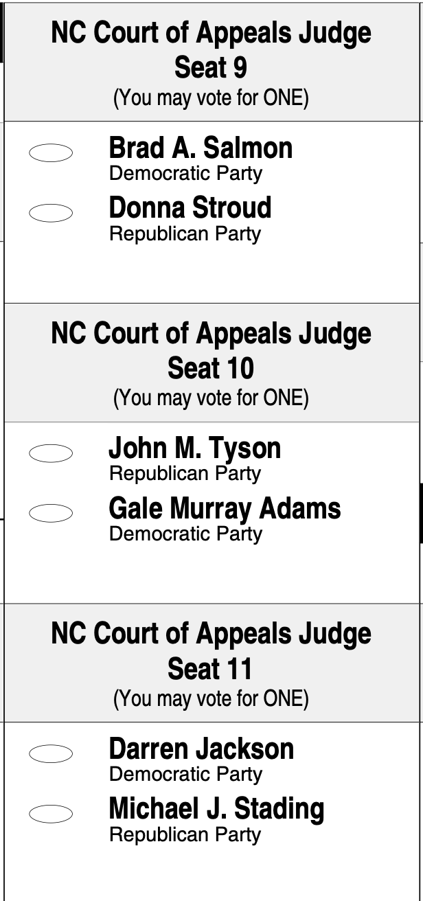 Darren Jackson was recently the Democrat leader in the NC House. To me, he came off like a HUGE wimp. But I give him major props for giving the Haymaker a shout-out on WRAL — describing the effect we have on his GOP colleagues. Though, he needs to stay in private practice. Michael Stading is the choice for seat 11.